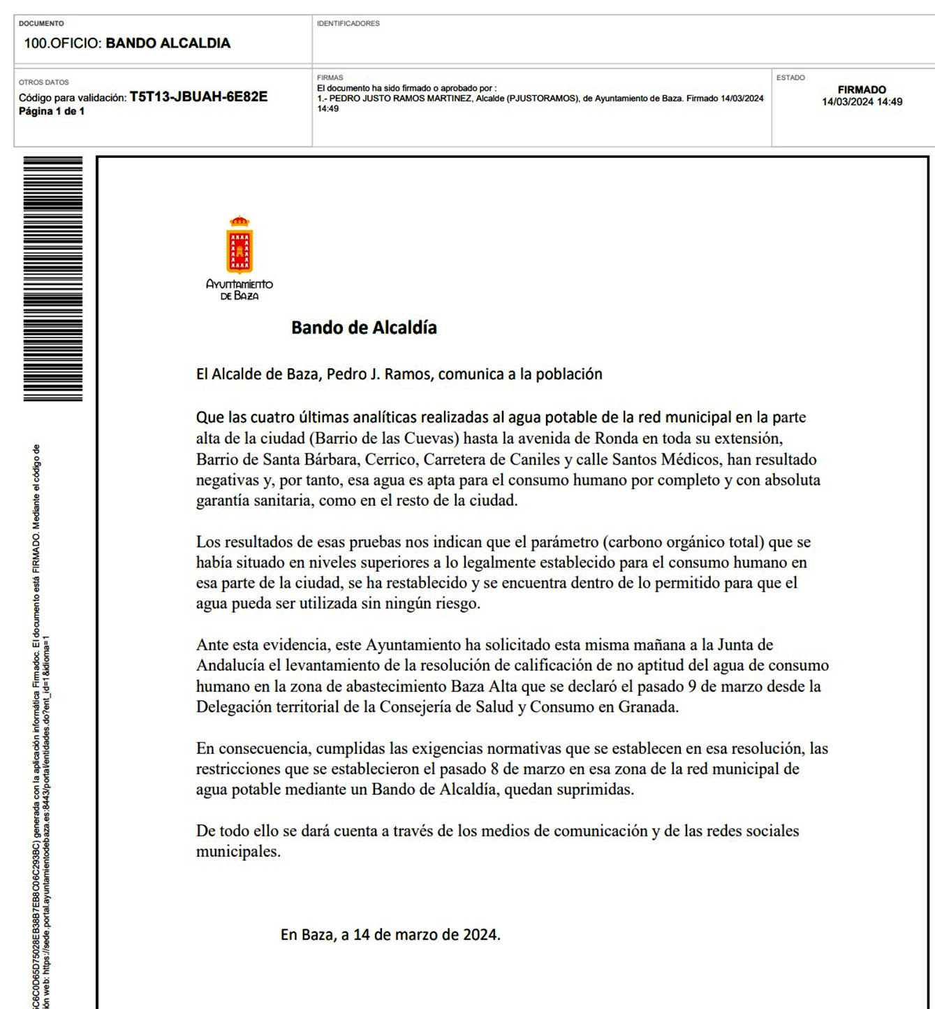 Una situación a la que se ponía fin mediante un Bando de la Alcaldía, emitido en la tarde de ayer, jueves 14 de marzo, tas la resolución de la delegación territorial de la Consejería de Salud y Consumo levantara la calificación de no aptitud del agua de consumo humano en la zona afectada. Un Bando con el que el alcalde de Baza, Pedro J. Ramos, ponía fin a las restricciones que se establecieron el pasado 8 de marzo, tras descubrirse que el agua de la zona afectada no reunía todas las condiciones para su consumo humano. Desde entonces se han sucedido varios controles y análisis en ese tramo de la red pública que, finalmente, han indicado que la salubridad del agua se ha recuperado por completo.