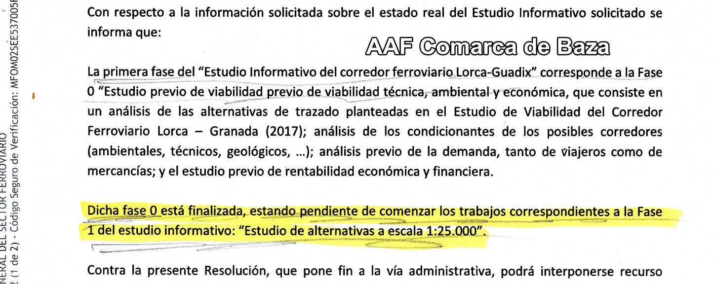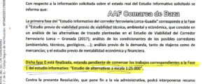Desde la Asociación Amigos del Ferrocarril Comarca de Baza y Comarca de Guadix por el Tren se exige mayor agilidad y prioridad para dichos trabajos, puesto que hasta ahora no lo ha sido. Este estudio informativo es imprescindible para «volver a pintar» la línea férrea en el mapa y poder acceder a su inclusión tanto en el Corredor Ferroviario Mediterráneo como en la Red TransEuropea de Transporte.