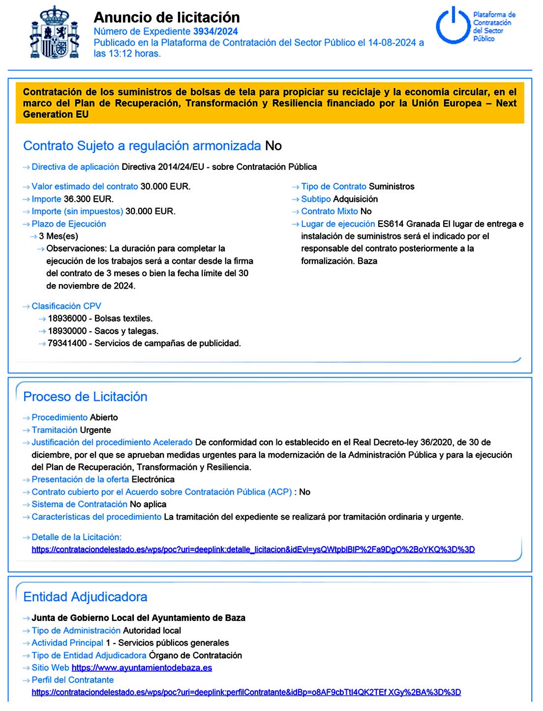 Se encuentra en periodo de licitación el suministro de bolsas de tela para promocionar el reciclado en el comercio de la ciudad, pudiéndose presentar ofertas hasta el 29 de agosto. La Plataforma de Contratación del Sector Público tiene ya publicado el anuncio de licitación que rige la contratación del suministro de bolsas de tela para promocionar el reciclaje y la economía circular, en el marco del Plan de Recuperación, Transformación y Resiliencia financiado por la Unión Europea-Next Generation EU, al cual se puede acceder a través del anterior enlace y se podrán presentar ofertas hasta el día 29 de agosto de 2024.