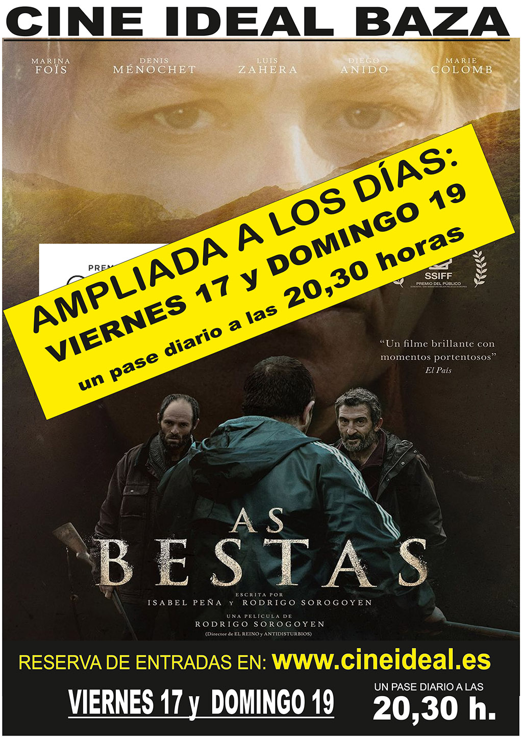 Debido a la gran demanda, se amplían los días de proyección de la película “As Bestas” en el Cine Ideal de Baza. Una de las películas que ha visto relanzada su promoción con motivo de la celebración de la gala de los Premios Goya donde fue la gran triunfadora al recibir los galardones a la mejor película, dirección, guion original, actor protagonista (Denis Ménochet), actor de reparto (Luis Zahera), Sonido, Fotografía, Música y Montaje. Nueve de los 17 a los que estaba nominada.