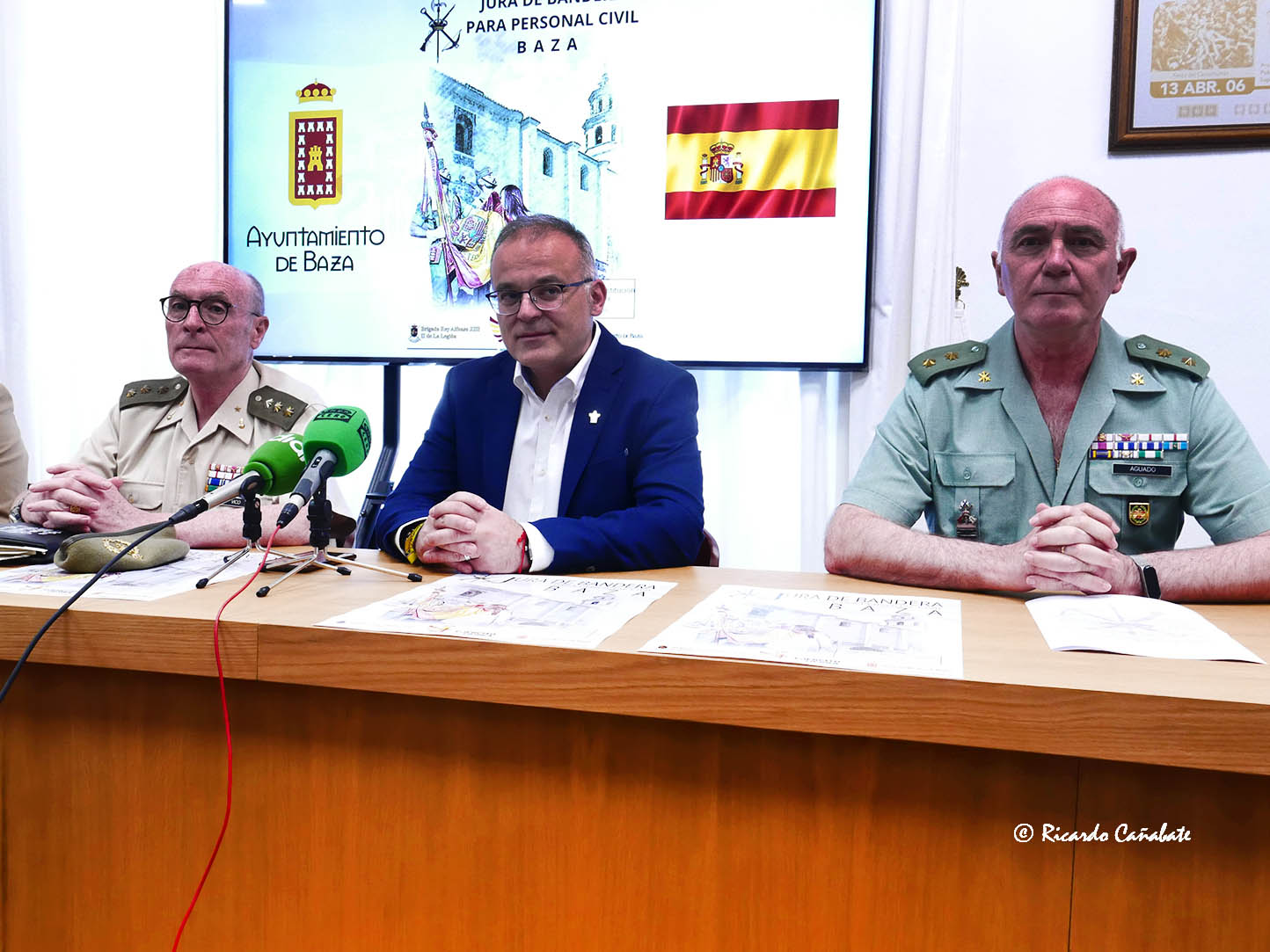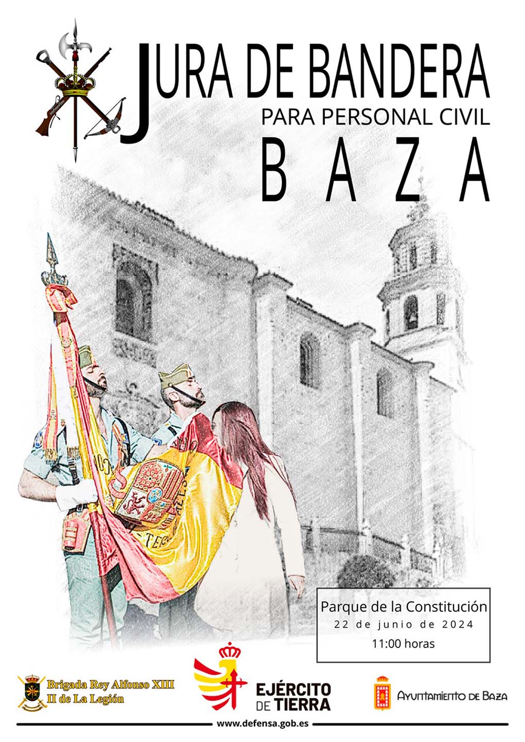 Presentada oficialmente la Jura de Bandera Civil que se celebrará en Baza el sábado 22 de junio en el Parque de la Constitución. El Parque de la Constitución y calles aledañas acogerán el sábado 22 de junio, desde las once de la mañana, la primera Jura de Bandera para personal civil que se celebrará en Baza y que podrán realizar aquellas personas que lo soliciten, con los únicos requisitos de ser mayores de 18 años, tener la nacionalidad española y no haber realizado otra jura de bandera en los últimos 25 años. Para ello, las personas interesadas deberán realizar su inscripción, algo que se puede hacer personalmente en la secretaría de la alcaldía del Ayuntamiento de Baza o a través de internet, si se dispone de certificado digital, en la página web del ministerio de Defensa a la que se accede desde el anterior enlace.