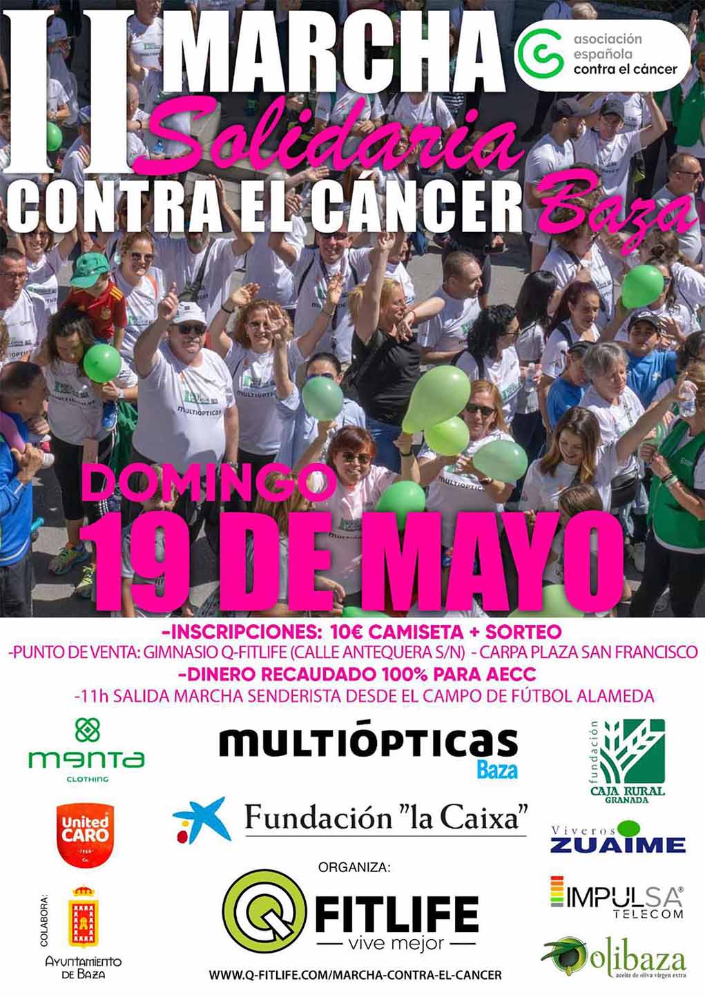 El próximo domingo, 19 de mayo, se celebrará en Baza la II Marcha Solidaria, una acción en la que se darán cita cientos de personas que teñirán de rosa las calles de la ciudad por las que discurrirá esta manifestación solidaria que organiza la Junta Local de la Asociación Española Contra el Cáncer y el gimnasio Qfit-Life, con la colaboración del Ayuntamiento de Baza y el patrocinio de Multiópticas Baza, Menta Tiendas, United Caro, Viveros Zuaime, Fundación Caja Rural, Olibaza, Impulsa Telecom y la Fundación La Caixa.