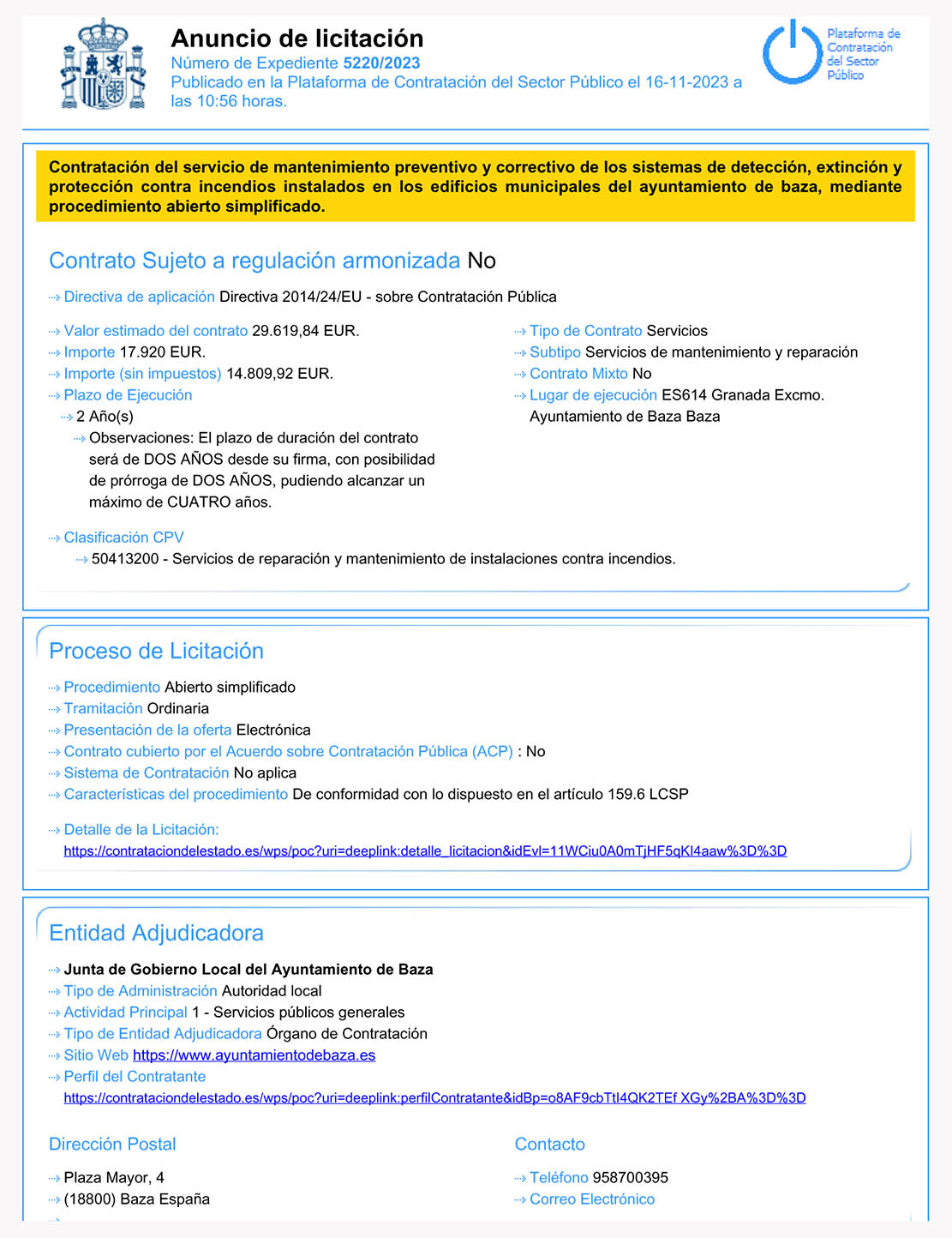 A tal fin, se ha procedido a la publicación del anuncio de licitación de Contratación del servicio de mantenimiento preventivo y correctivo de los sistemas de detección, extinción y protección contra incendios instalados en los edificios municipales del Ayuntamiento de Baza, mediante procedimiento abierto simplificado, con un plazo de presentación de ofertas hasta el próximo día 01/12/2023.