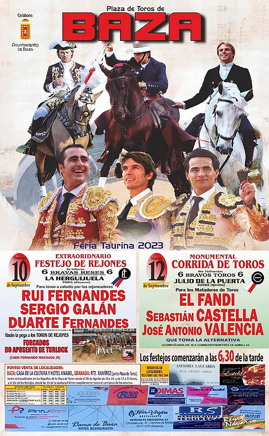 Cartel taurino para la Feria de Baza, con un festejo de rejones y una corrida con alternativa, los días 10 y 12 de septiembre. La empresa TauroSevilla ha hecho oficiales los dos carteles que ha confeccionado para la feria taurina de nuestra localidad, los cuales están compuestos por un extraordinario festejo de rejones para el domingo 10 de septiembre y la tradicional corrida del día 12 de ese mismo mes, en la que se anuncia una alternativa, tras haber cambiado los integrantes de los carteles en el anuncio realizado hace unas semanas.
