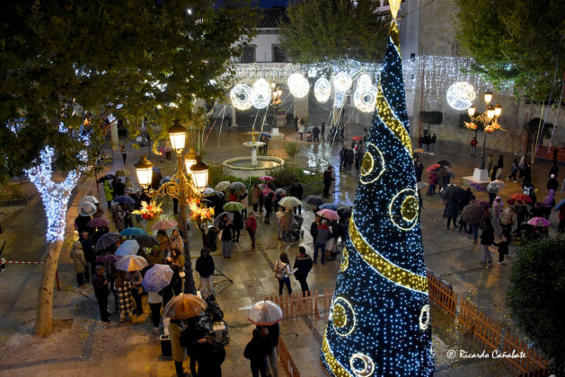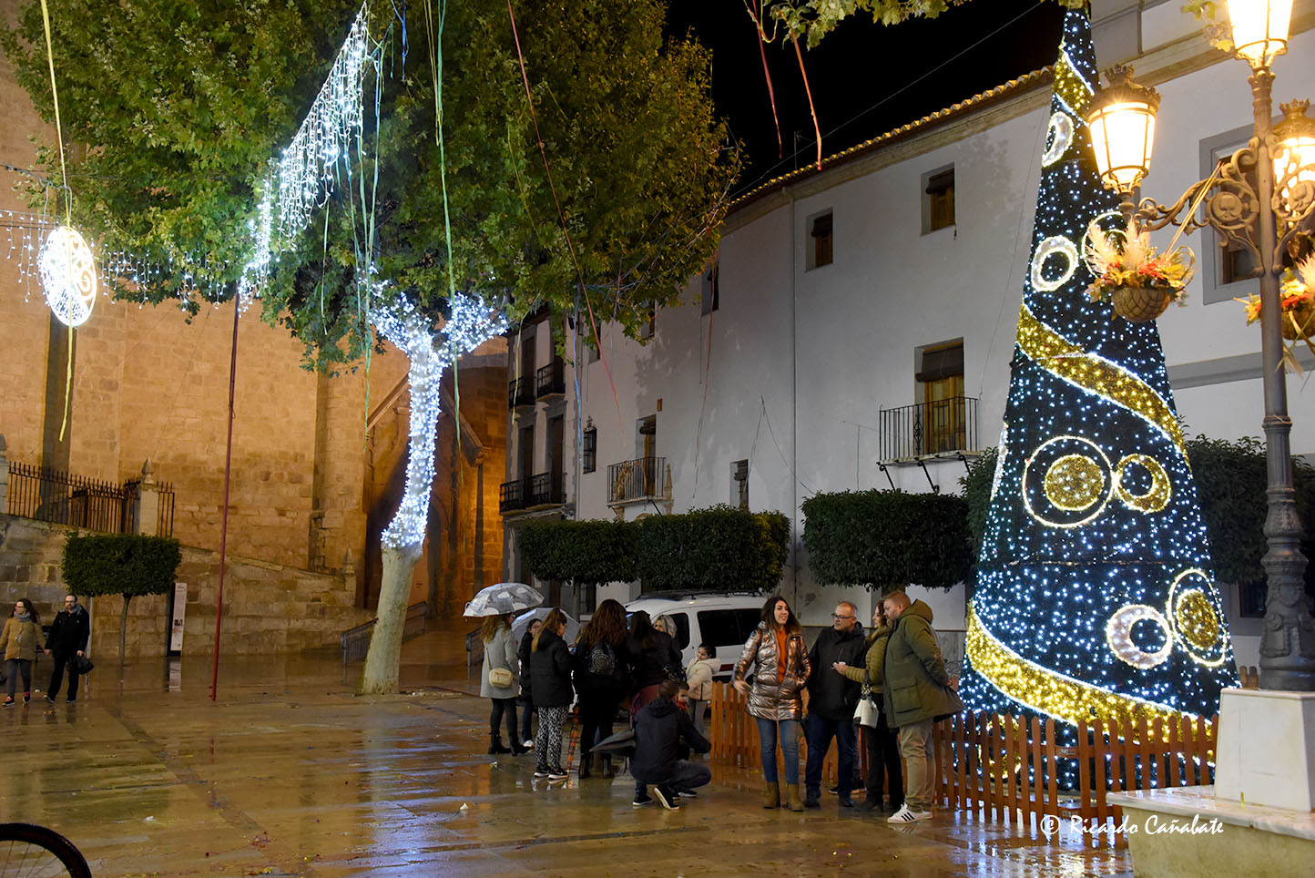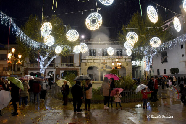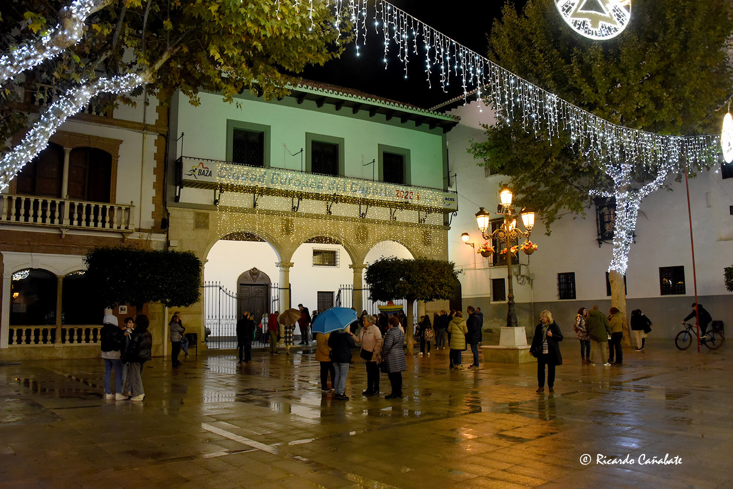 La iluminación extraordinaria inauguraba ayer en Baza la campaña prenavideña, con la lluvia como invitada inesperada. Una lluvia tan deseada como capaz de aparecer en el momento en que la Plaza Mayor registraba una notable presencia de personas y que, a pesar de su escasa duración, sí que fue capaz de desalojar la plaza y acabar retirando a un público que ya no se incorporó a las actividades previstas.