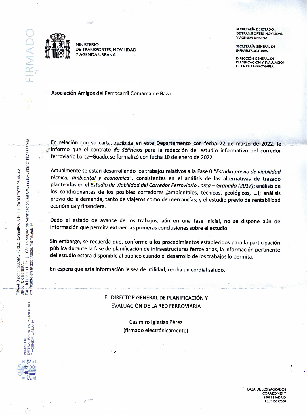 En estos términos se ha dirigido por carta el Director General de Planificación y Evaluación de la Red Ferroviaria, Casimiro Iglesias Pérez, a la Asociación Amigos del Ferrocarril Comarca de Baza.