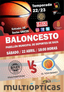 El Multiópticas Baza termina la fase regular a 40 minutos de unos play off con el factor campo a favor. EL Multiópticas Baza se encuentra a 40 minutos de disputar unos play off ante un CB Toyo que no se juega nada, quizás sea ese el mayor de los inconvenientes de los chicos de Mariano García, que tendrán que aguantar la presión de saber lo que se juegan mañana sábado, en el Pabellón de Baza, con horario unificado 18.00 h., en esta última jornada de liga.