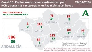 Por provincias, en Almería se contabilizan 12 brotes que suman un total de 399 casos; en Cádiz se contabilizan 8 brotes que suman un total de 88 casos; en Córdoba se contabilizan 5 brotes que suman un total de 198 casos; en Huelva se contabilizan 5 brotes que suman un total de 41 casos; en Jaén se contabilizan 3 brotes que suman un total de 45 casos; en Málaga se contabilizan 14 brotes que suman un total de 199 casos; y en Sevilla se contabilizan 12 brotes que suman un total de 176 casos con unas cifras muy similares a los ya mencionados 12 brotes y 186 casos activos de Granada.