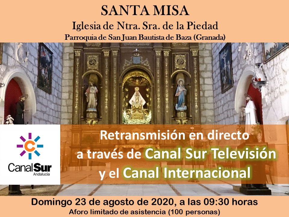 La cadena autonómica Canal Sur TV y su canal internacional retransmitirá la misa del domingo, en directo, desde el Templo de la Virgen de la Piedad, a las 9,30 de la mañana. Con motivo de la situación impuesta por la pandemia del coronavirus y el confinamiento al que fue sometida la población, la Radio Televisión de Andalucía tomó la decisión de llevar la celebración de la Santa Misa a todos los hogares de Andalucía, con una transmisión en directo que se puso en marcha el pasado Domingo de Resurrección, coincidiendo con el comienzo de la Pascua y con la pretensión de prestar un servicio público y responder a la demanda de un amplio sector de la sociedad que profesa la religión católica y desea poder seguir desde casa la Eucaristía cada semana.