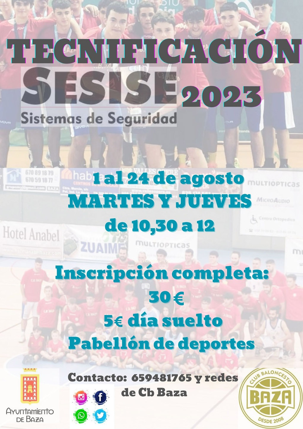 El CB Baza y la empresa SESISE organizan las tradicionales jornadas de tecnificación en los prolegómenos de la nueva temporada. Una jornadas que se celebrarán del 1 al 24 de agosto, todos los martes y jueves de 10.30 a 12, y a las que puede acudir cualquier niño/a, desde los 6 años, para disfrutar de esta tradicional tecnificación patrocinada por SESIE, una empresa de seguridad puntera en Baza, a la que desde el CB Baza se agradece su apoyo al baloncesto bastetano.