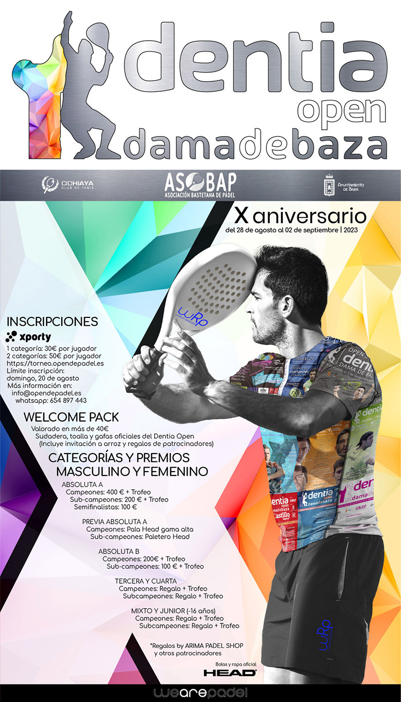 Diez años después de su creación, el Dentia Open Dama de Baza de pádel es una cita deportiva imprescindible en la programación de nuestra ciudad. No solo por su carácter amateur y su extensión social y cultural, sino porque gracias a esta competición viajan hasta Baza los mejores jugadores de pádel de España e incluso del mundo. Algunos de ellos, como Javi Ruiz, se han “quedado” con la organización como asesores técnicos del torneo. “Para nosotros es un orgullo haber puesto a Baza en el mapa del pádel”, afirma el presidente de ASOBAP, Javier Arias, que ha confirmado que el presupuesto de esta edición va a superar los 20.000 euros, de los cuales más de 7.000 se destinan a premios y regalos a los participantes. En su primera década de vida, el Dentia Open Dama de Baza ha recorrido todas las pistas de pádel que se han construido en la ciudad, algunas de ellas ya desaparecidas, ha visto pasar a más de mil jugadores, algunos de ellos en distintas ediciones, y ha conseguido situarse como un referente provincial y regional de este deporte.