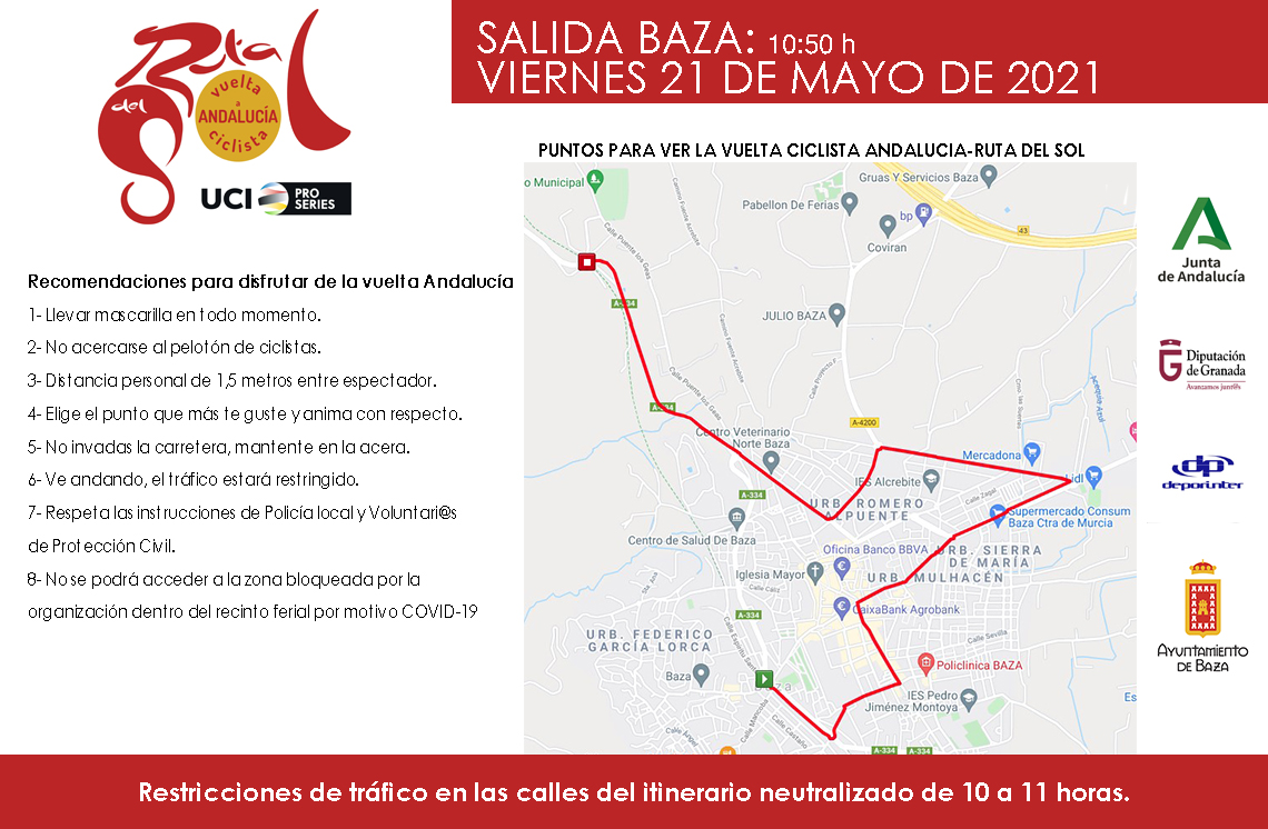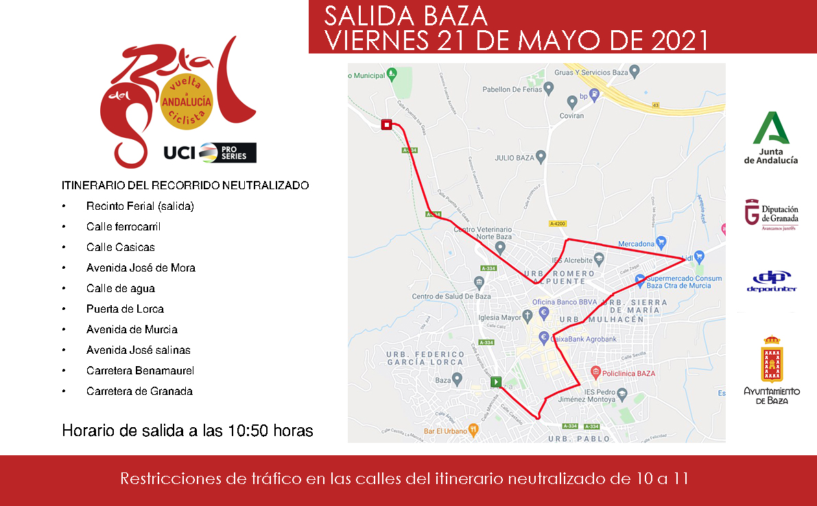 La 4ª etapa de la 67 edición de la Vuelta a Andalucía sale este viernes a las 10.50h desde el recinto ferial de Baza para recorrer un tramo neutralizado por la ciudad. La 67 edición de la Vuelta a Andalucía – Ruta del Sol tiene la salida de su 4º etapa mañana viernes 21 de mayo desde la ciudad de Baza. La recepción de autoridades está prevista que se realice a las diez de la mañana en el recinto ferial, donde se celebrará un acto de entrega de distintivos. Desde ese lugar se iniciará también a las 10.50h un recorrido neutralizado de los ciclistas participantes en la Vuelta con el siguiente recorrido: recinto ferial (salida), calle Ferrocarril, calle Casicas, Avenida José de Mora, calle de Agua, Puerta de Lorca, Avenida de Murcia, Avenida José Salinas, carretera Benamaurel, carretera de Granada.