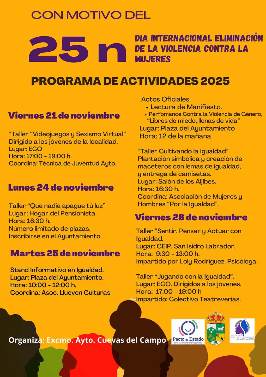 Cuevas del Campo refuerza su compromiso contra la violencia machista con un amplio programa por el 25N. El Ayuntamiento de Cuevas del Campo ha puesto en marcha una agenda de actividades para conmemorar el Día Internacional de la Eliminación de la Violencia contra la Mujer, que se celebra cada 25 de noviembre. La alcaldesa, Carmen Rocío Martínez, ha destacado que esta fecha representa “compromiso y unidad” frente a cualquier forma de violencia que sufren mujeres y niñas, a la vez que ha llamado a “no bajar la guardia” en la lucha contra el machismo.