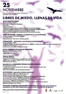 Una amplia y variada programación que busca sensibilizar a todos y trabajar en la prevención desde edad temprana, bajo el lema “Libres de miedo, llenas de vida”. Un programa cuyo acto central tendrá lugar el lunes 25 de noviembre a las 12.00 h, en la plaza contigua a la Biblioteca Municipal, e incluirá la lectura del manifiesto del Consejo Municipal de la Mujer, un homenaje a las víctimas y actuaciones musicales.