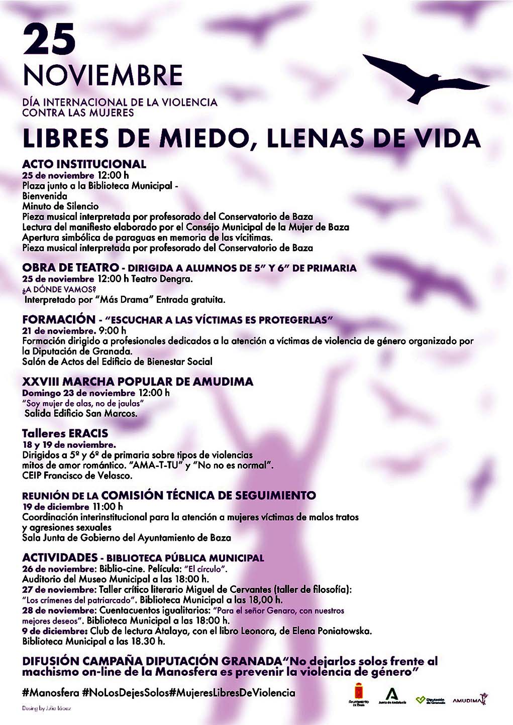 Baza conmemorará el 25N, Día Internacional de la Eliminación de la Violencia Contra la Mujer, en un 2025 que ha dejado ver un incremento de los casos. La ciudad de Baza se sumará un año más a la conmemoración del Día Internacional de la Eliminación de la Violencia contra la Mujer, marcado este 2025 por un repunte en las atenciones y casos registrados. Bajo el lema “Libres de miedo, llenas de vida”, el Ayuntamiento ha diseñado una programación que busca reforzar la sensibilización social y la coordinación institucional ante una realidad que sigue mostrando cifras preocupantes.