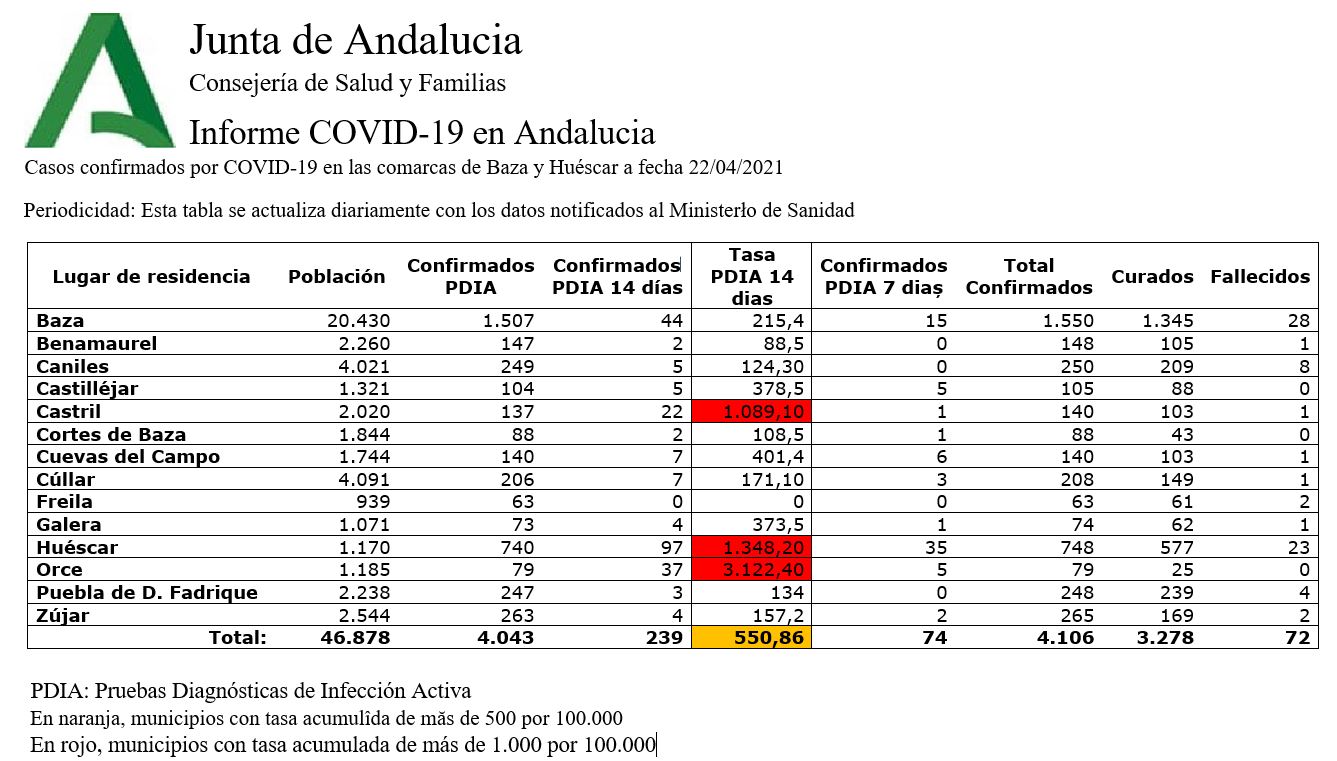 A continuación, ofrecemos los datos ofrecidos ayer por La Junta de Andalucía, sobre la situación en los diferentes municipios de las comarcas de Baza y Huéscar: