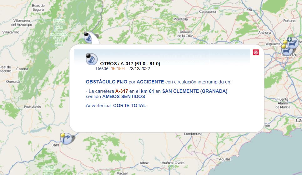 Un siniestro sin heridos de un camión cortó la A-317, en el entorno del embalse de San Clemente, en ambos sentidos. La carretera A-317 permaneció cortada al tráfico en la tarde de ayer jueves, a la altura del kilómetro 61, una zona que se encuentra en el entorno del embalse de San Clemente, en término de Huéscar, en el norte de la provincia de Granada, tras quedar atravesado un camión en la calzada, en un siniestro que se saldó sin heridos.