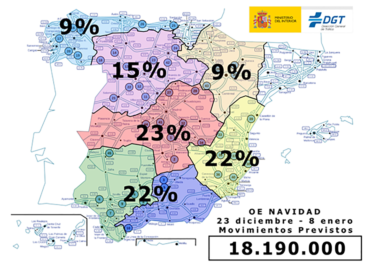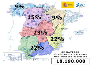 Tráfico prevé una operación especial en la que se esperan 18,2 millones de desplazamientos por carretera durante la Navidad. A partir de las 15:00 horas de hoy viernes 23 de diciembre, la Dirección General de Tráfico pone en marcha el dispositivo especial de regulación, ordenación y vigilancia de los 18,2 millones de  desplazamientos por carretera previstos que se realizarán con motivo de las fiestas navideñas y que finalizará el domingo 8 de enero de 2023.