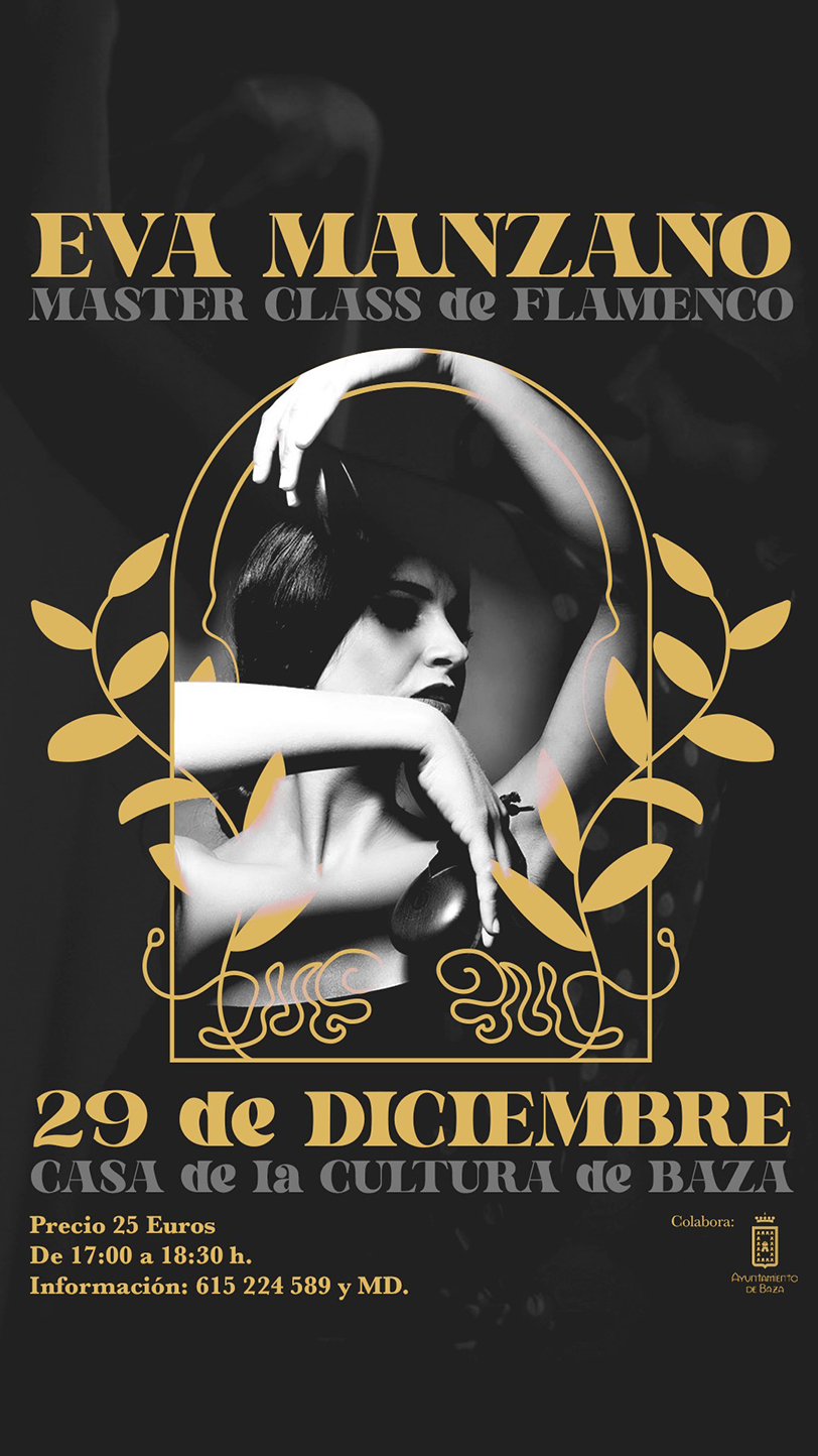 La máster class de flamenco con  Eva Manzano se llevará a cabo en la fecha citada y en horario de 17,00 h. a 18.30 h., con un precio por persona de 25 euros, pudiendo obtenerse la información que se precise sobre ella en el teléfono 615 224 589, para lo que hay que agradecer el que se desplace expresamente hasta Baza, desde donde partirá de inmediato para cumplir con sus compromisos profesionales que se reanudan con un vuelo que la llevará a la mítica ciudad de Marrakech, donde será la protagonista bailando en un gran evento con motivo del fin de año que se celebrará en esta ciudad marroquí.