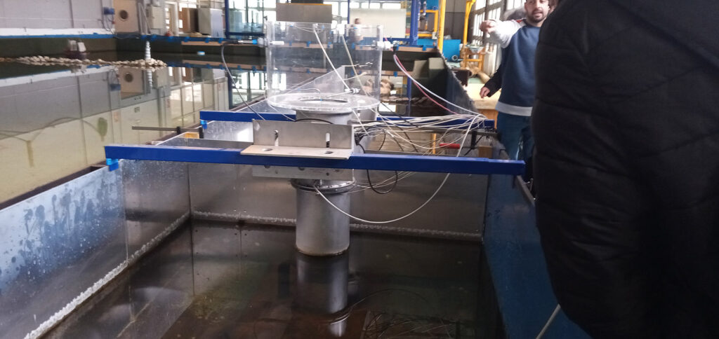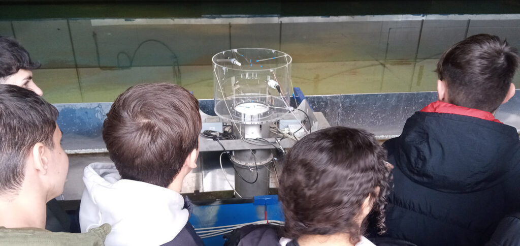 Durante esta primera sesión, el alumnado combinó contenidos teóricos y prácticos. En la parte teórica, aprendió a calcular la energía que puede generar una ola a partir de determinadas características físicas. Posteriormente, en la parte práctica, pudo conocer el funcionamiento de la tecnología OWC (Columna de Agua Oscilante), un sistema de generación de energía undimotriz —procedente del oleaje— que utiliza cámaras semisumergidas donde el movimiento de las olas comprime y descomprime el aire, haciendo girar una turbina bidireccional para producir electricidad.
