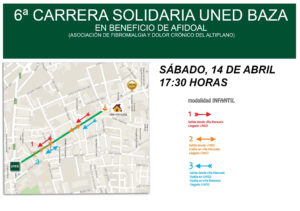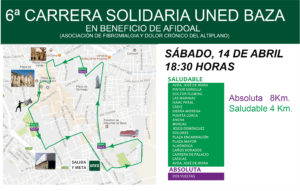 El Centro Asociado a la UNED en Baza organiza la 6ª Carrera Solidaria a favor de la asociación “AFIDOAL” Asociación de Fibromialgia y Dolor Crónico del Altiplano. El Centro Asociado a la UNED en Baza es una Universidad especialmente abierta a las demandas sociales y muy ligada a la realidad local, satisfaciendo demandas culturales y sociales en aquellos lugares y de aquellos colectivos que las universidades presenciales no alcanzan.