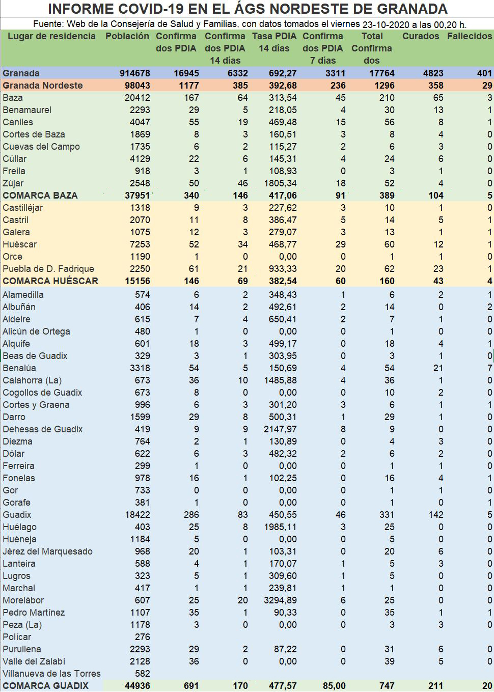 Informe Covid-19 en el AGS Nordeste de Granada, según datos de la Consejería de Salud y Familias, correspondientes al viernes 23-10-2020 a las 00,20 h.: