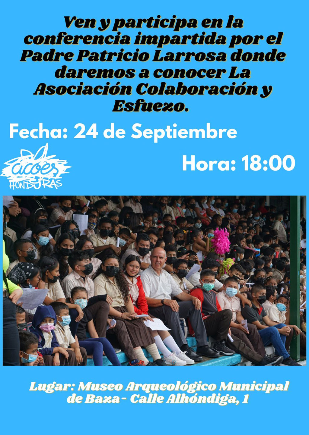 El Padre Patricio Larrosa hablará en Baza, este sábado, sobre el trabajo de la Asociación Colaboración y Esfuerzo. ACOES trabaja por el desarrollo del pueblo hondureño con más de 8000 niños y niñas escolarizados y 68 proyectos en marcha con la colaboración de voluntarios de España, Francia y Canadá.
