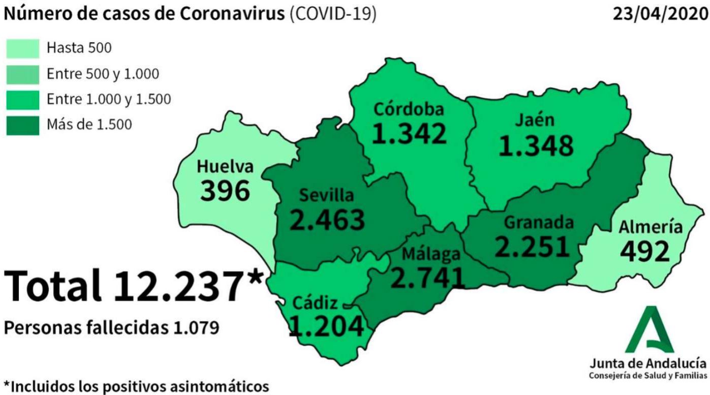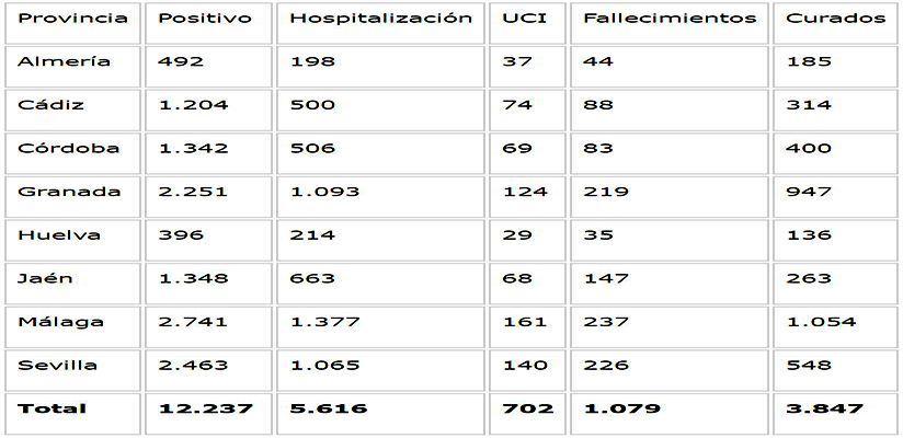 La Consejería Salud y Familias informa que se han confirmado en Andalucía 316 nuevos casos de Coronavirus en las últimas horas. La Consejería Salud y Familias informa que se han confirmado en Andalucía 316 nuevos casos de Coronavirus en las últimas horas. Así, el número total de afectados en Andalucía asciende a 12.237.