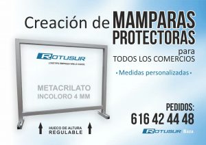 Hoy traemos un ensaje de la empresa Rotusur con una oferta de construcción de mamparas protectoras para todos los comercios, en metacrilato incoloro de 4 mm. Y con hueco inferior de altura regulable y medidas personalizadas.