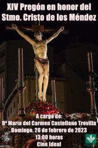 El domingo 26 será el turno de Carmen Castellano que pregonará a la Real Cofradía del Stmo. Cristo de los Méndez. La Real Cofradía del Stmo. Cristo de los Méndez organiza la decimocuarta edición de su pregón, el cual se celebrará el domingo 26 de febrero, en el Cine Ideal, a las 13 horas, habiendo sido elegida Carmen Castellano para cumplir la misión de pregonar al Cristo titular de la Iglesia Mayor.