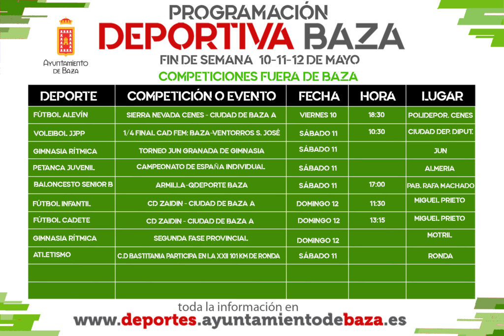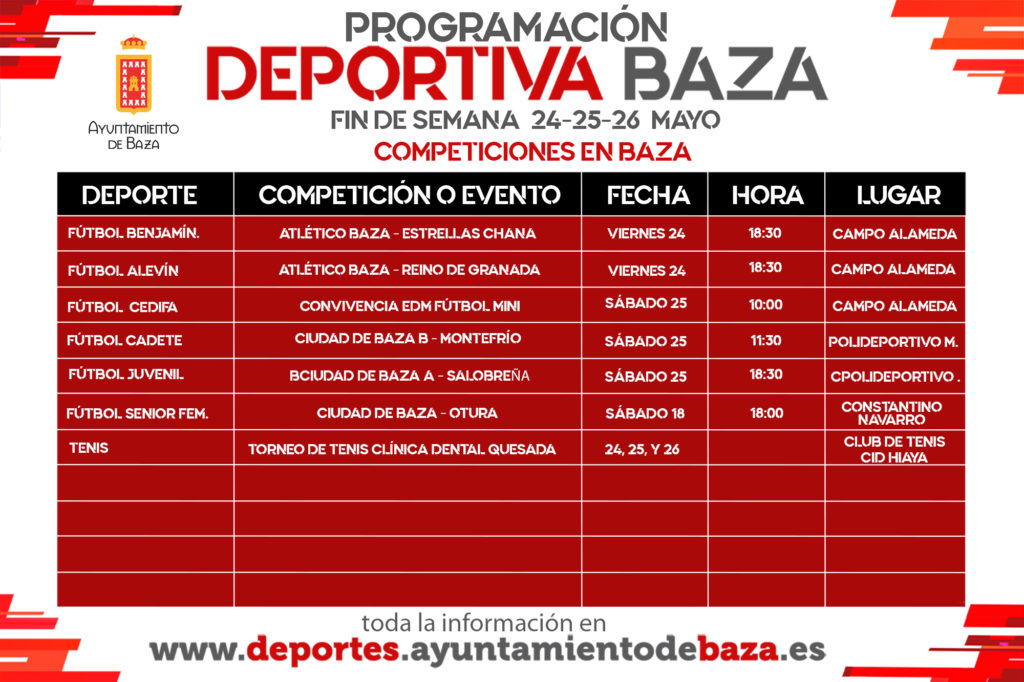 Programación deportiva para el fin de semana 24, 25 y 26 de mayo. En la programación deportiva para este fin de semana cabe destacar el Torneo de Tenis Clínica Dental Quesada, que organiza el Club de Tenis Cid Hiaya, para las categorías desde benjamín hasta absoluto. Además, los clubes de fútbol Atlético Baza y Ciudad de Baza siguen compitiendo con los equipos que finalizan la liga más tarde.