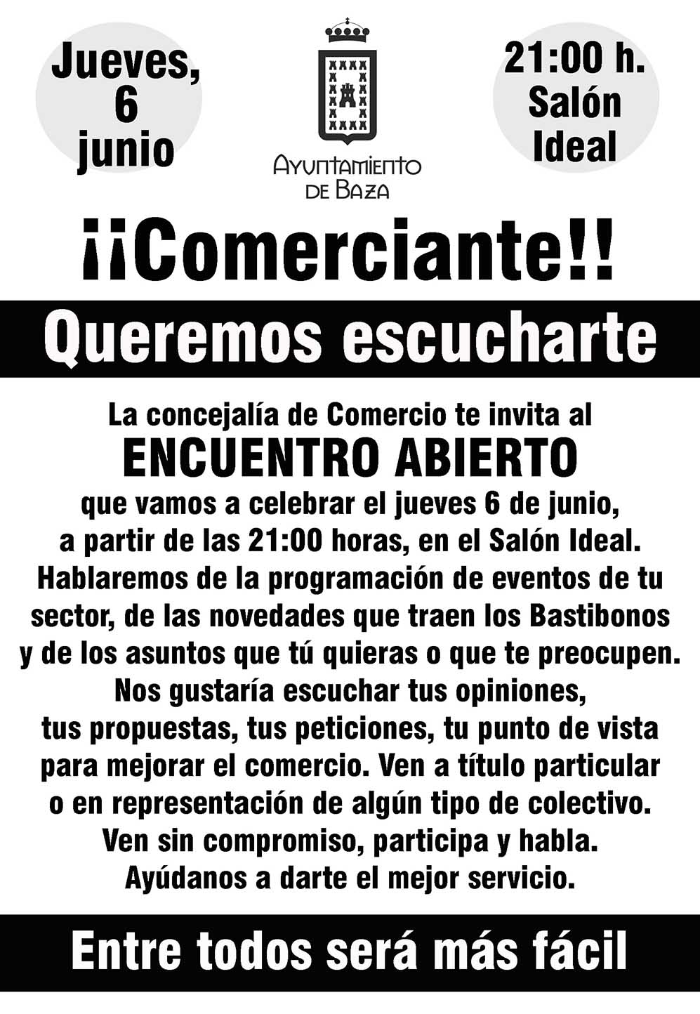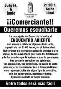 Entiende Valdivieso que es necesario el mayor consenso para establecer cuestiones como fechas, horarios u otras actividades, algo que hará que los resultados sean mejores, que aumente la participación de los establecimientos y que el uso del dinero público sea más eficiente. Para ello ha convocado una reunión abierta con los comerciantes locales, que se celebrará el próximo 6 de junio, jueves, a las 21:00 horas en el Salón Ideal, fijando su principal objetivo en que acudan todos los comerciantes de la ciudad y expresen sus criterios y propuestas sobre una serie de asuntos que afectan directamente al sector, de forma que se cuente con el mayor apoyo para las decisiones que se tomen.
