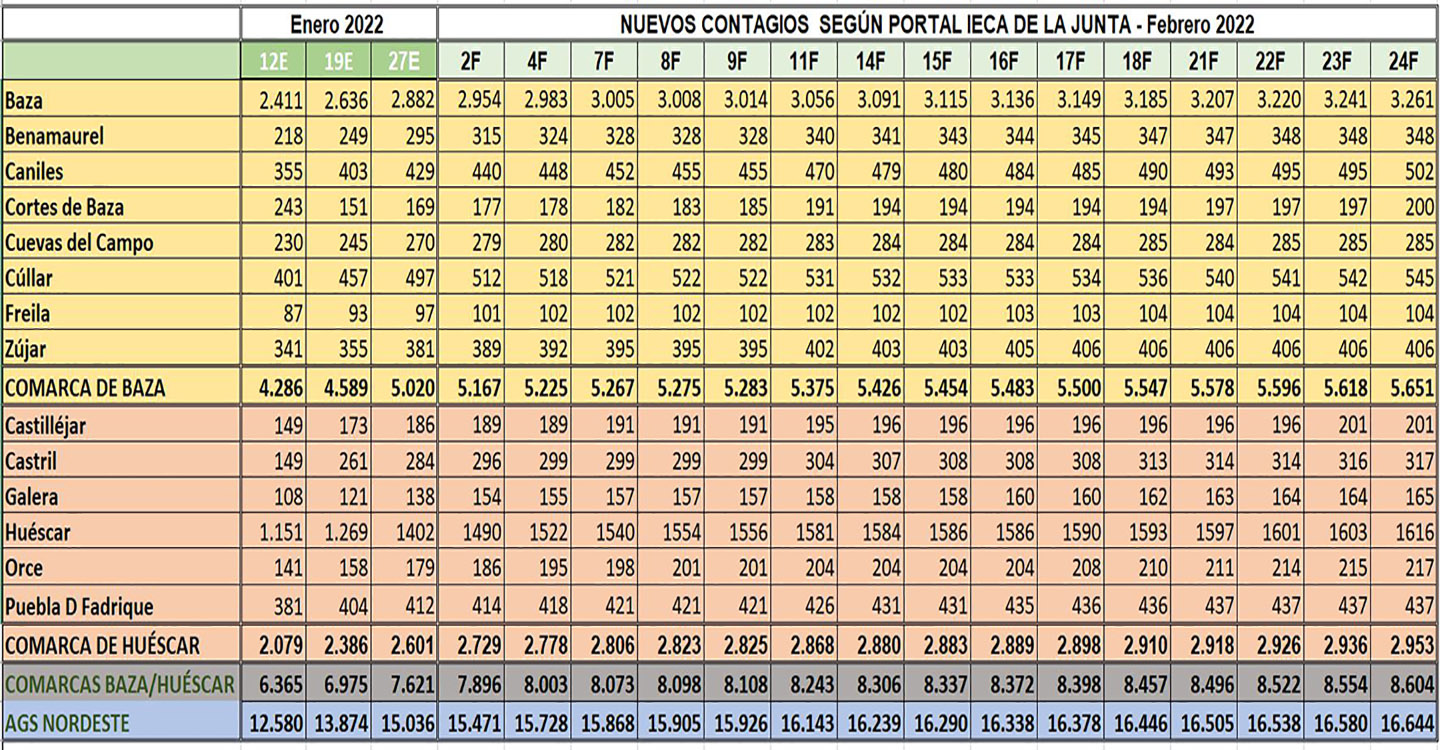 50 casos nuevos, pues, que sumaban las dos comarcas norteñas, frente a los 14 que se añadían en la comarca de Guadix y que elevaban el total del AGS Nordeste de Granada hasta los 64, cifra que impide la continuidad de un decidido descenso  pues localidades como Baza, Caniles, Cortes de Baza, Huéscar y Orce empeoraban su tasa de incidencia a 14 días, mientras que Benamaurel, Castilléjar y Castril la mejoraban y el resto de localidades mantenían la tasa de incidencia del día anterior.