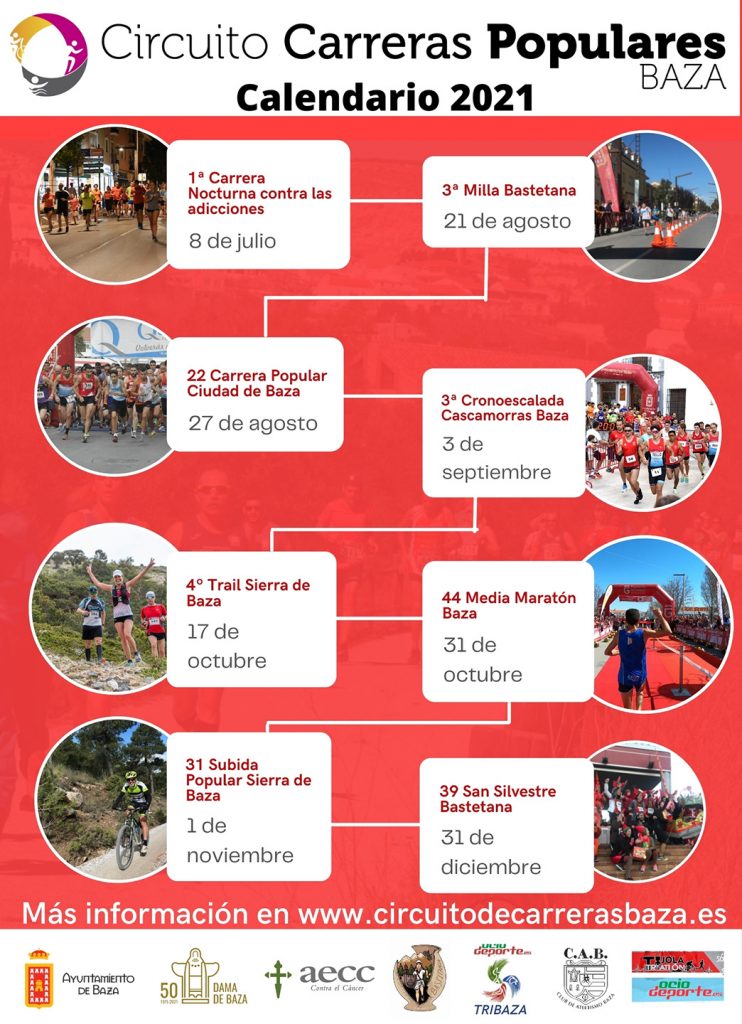 Por otro lado, el Circuito de Carreras Populares oferta 8 pruebas deportivas de carácter popular en las que no habrá formato de circuito a nivel de competición, “solo premiaremos la participación buscando que sea el máximo número de personas posible las que participen”. Habrá una inscripción voluntaria al circuito que irá destinada a la Asociación Española Contra el Cáncer (cada prueba tendrá su propia inscripción entre 3 y 15 euros aproximadamente). Hay que tener en cuenta que todas las pruebas contemplarán los protocolos Covid-19 en vigor y que los cambios que se producen tanto en la salida como en los momentos de convivencia hay que verlos como una oportunidad de potenciar el acto deportivo. Precisamente el circuito arranca el 8 de julio con la Carrera Nocturna Contra las Adicciones, con un recorrido de 5 km y un precio de inscripción de 3 euros. Toda la información está disponible ya en www.circuitodecarrerasbaza.es