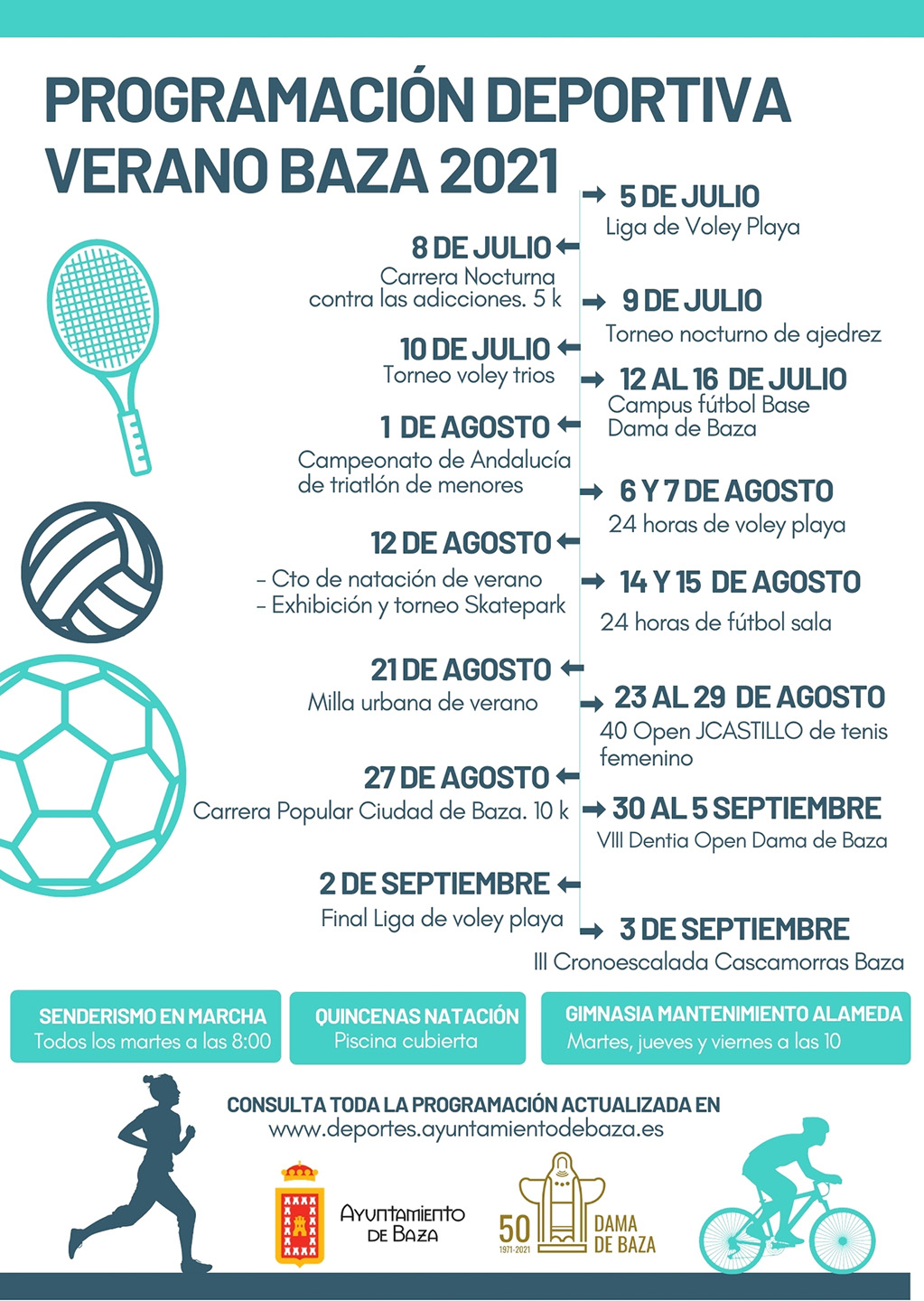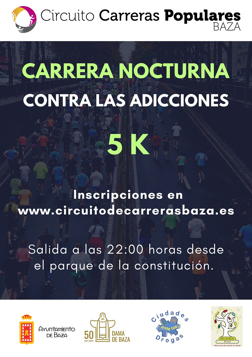 El deporte se reactiva en Baza con una completa programación deportiva de verano y el Circuito de Carreras Populares. El Ayuntamiento de Baza afronta los meses de verano con la ilusión de poder reactivar la actividad deportiva tras estos meses duros de incertidumbre. Se ha diseñado para ello una completa programación deportiva de verano que contempla también la recuperación del Circuito de Carretas Populares, cita que este año comienza con una novedad: la Carrera Nocturna Contra las Adicciones ‘5 k’.