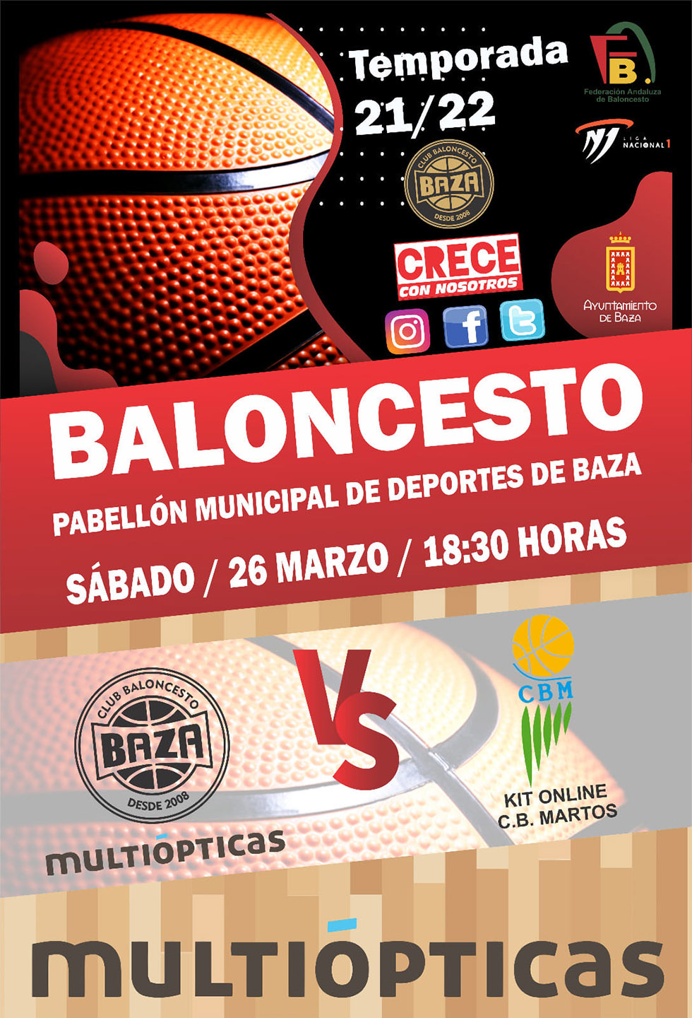 Fin de semana cargado de Baloncesto en el Pabellón Municipal en el que destaca la visita del CB Martos al Multiópticas Baza. Nueva jornada de la Primera Nacional de Baloncesto en la que el Multiópticas Baza recibe al Club Baloncesto Martos, en lo que es encuentro de tradición, disputado tanto en Nacional como EBA, por lo que se podrán ver muchos clásicos del baloncesto andaluz el próximo sábado a las 18.30 horas.
