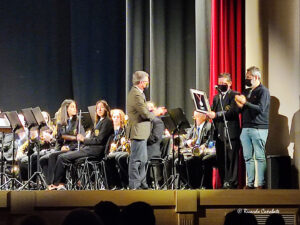 Fue también el momento en el que el presidente de la Federación de Cofradías, Ángel Martínez Bocanegra, y el alcalde bastetano, Manolo Gavilán, accedieron al escenario para hacer entrega al director de la Banda de una medalla enmarcada, como reconocimiento a la labor realizada desde años atrás.