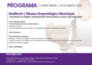 La sesión se celebrará desde las 17h en el Auditorio del Museo Arqueológico. La primera ponencia estará dedicada al protocolo para la atención a mujeres con discapacidad víctimas de violencia en la pareja y correrá a cargo de la psicóloga feminista María del Carmen Plaza Sánchez. También se hablará del proceso de recuperación de la víctima para entender su decisión de no continuar en un procedimiento judicial por violencia de género, en este caso de la mano de la psicóloga del grupo de investigación ‘Mujeres, Bienestar y Ciudadanía’ María García Jiménez.
