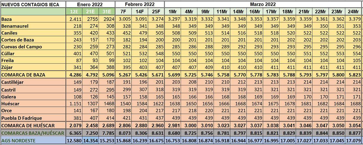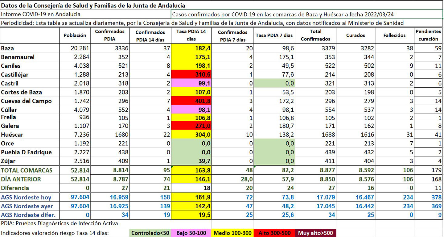 El 17 repunte de nuevos casos Covid en Baza afecta a una subida de tasas generalizada en el AGS Nordeste y en las comarcas de Baza y Huéscar. Diecisiete nuevos casos en Baza que, unidos a otros diez en las comarcas de Baza y Huéscar y siete más en la comarca de Guadix, nos llevaban al último comunicado de la Consejería de Salud y Familias a una ya desacostumbrada cifra de 34 contagios que hacía subir el número de confirmados PDIA a 7 y a 14 días, así como las respectivas tasas de incidencia en el AGS Nordeste de Granada, donde se pasaba a 73,8 (25,6 más) y 161,9 (19,5 más) casos por 100.000 habitantes.