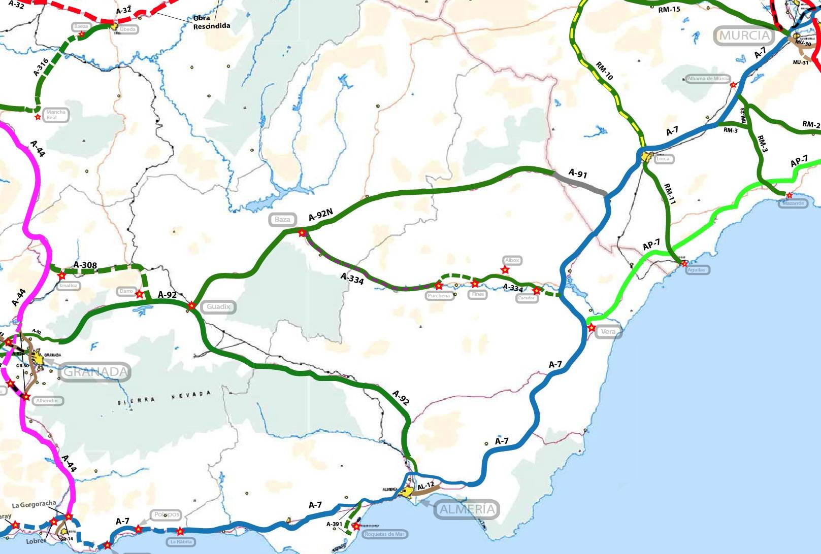 La Junta de Andalucía no hará el segundo tramo de la autovía del Almanzora hasta Baza y habla ahora de aumentar la capacidad de la carretera. La consejera de Fomento, Articulación del Territorio y Vivienda, Marifrán Carazo, ha informado de que ya se encuentra en redacción «el estudio de viabilidad para aumentar la capacidad y mejorar la seguridad vial de la carretera A-334 desde Baza hasta los tramos ya ejecutados de la Autovía del Almanzora», descartando por ahora convertir en autovía la A-334 desde Baza hasta Fines, donde comienza la llamada ‘Autovía del Mármol’, lo que bien podría acabaren hacer algunos carriles de aceleración en tramos de la actual carretera, para facilitar los adelantamientos.