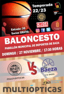 El Multiópticas Baza recibe el domingo al CB Baeza, en el último encuentro en Baza antes del parón navideño. El próximo domingo, 27 noviembre, el Multiópticas Baza recibe al CB Baeza en un encuentro que supondrá un parón de partidos en Baza hasta después de Navidad, por lo que es fundamental la victoria para volver a tener la conexión que se produce cuando el equipo bastetano juega en casa.