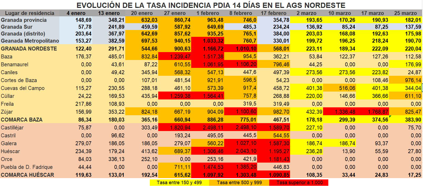 También bajaron ligeramente las tasas de incidencia, al pasar de 188 a 182 casos por cada 100.000 habitantes en la media provincial, siendo la zona Norte la más afectada, con una tasa de 200, mientras que Granada capital tiene una tasa de 176, el Metropolitano 190 y el distrito Sur tenía 137 casos por cada 100.000 habitantes.
