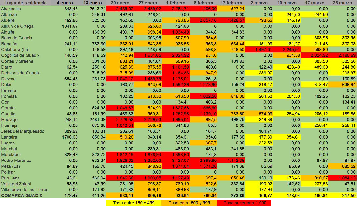 Además, hay tres municipios que ayer superaban los 1.000 casos por cada 100.000 habitantes: Cogollos de Guadix, con la tasa más alta de la provincia (2.180,7); Purullena con 1.084,1 y Nevada que tenía ayer 1.212,7 casos por cada 100.000 habitantes, si bien este último municipio, compuesto por cuatro núcleos poblacionales, no se verá obligado a cerrar sus negocios no esenciales, ni a cerrar sus fronteras por la evolución especial que ha recibido de la Junta, al tener una población por debajo de los 1.500 habitantes.