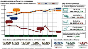 Un descenso que está relacionado con la caída del número de personas activas, que en la provincia ha descendido en 10.000, desde octubre. Además, finalizó 2022 con 356.500 personas ocupadas, mejorando en 5.100 al trimestre anterior, a lo que se une la disminución de 1.300 personas que buscan su primer empleo, lo cual conlleva que la provincia sitúe su tasa de activos en un 56,3% de la población, frente a la de 43,1% de inactivos. A estas cifras se añade que el 80% de granadinos de nuestra provincia está ocupado, frente al 19,7% de parados.