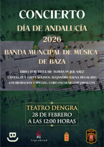 Al día siguiente, el sábado 28 de febrero a las 12:00 horas, será el turno de la Banda Municipal de Música de Baza, que ofrecerá su tradicional concierto institucional con motivo del Día de Andalucía. Bajo la batuta de su director titular la formación interpretará un repertorio de música popular especialmente seleccionado para la ocasión.
