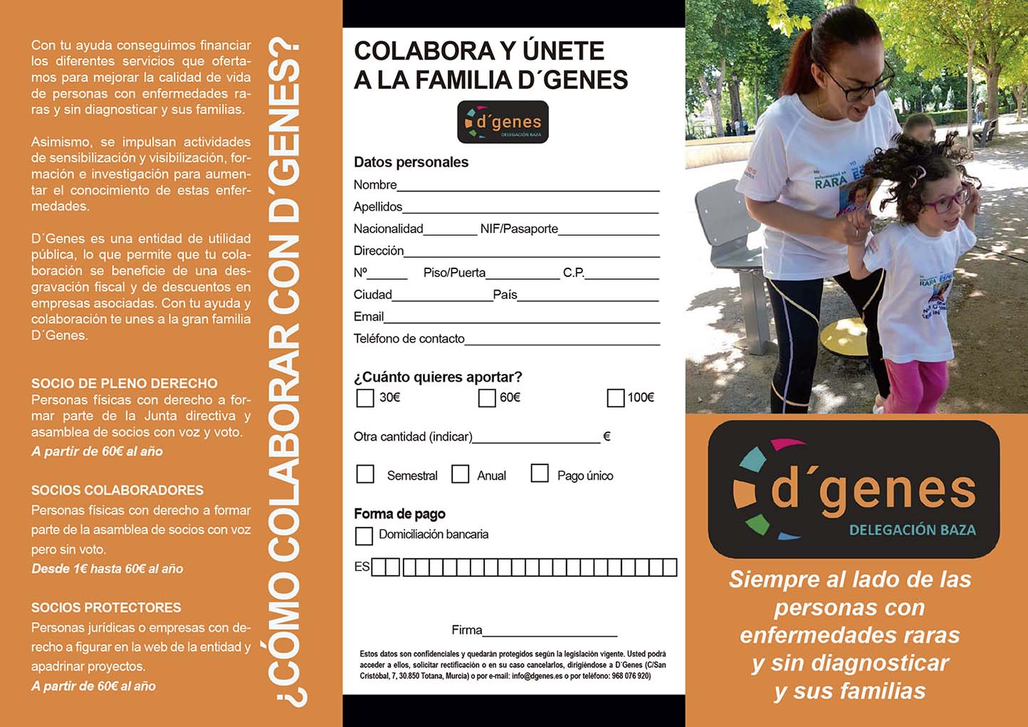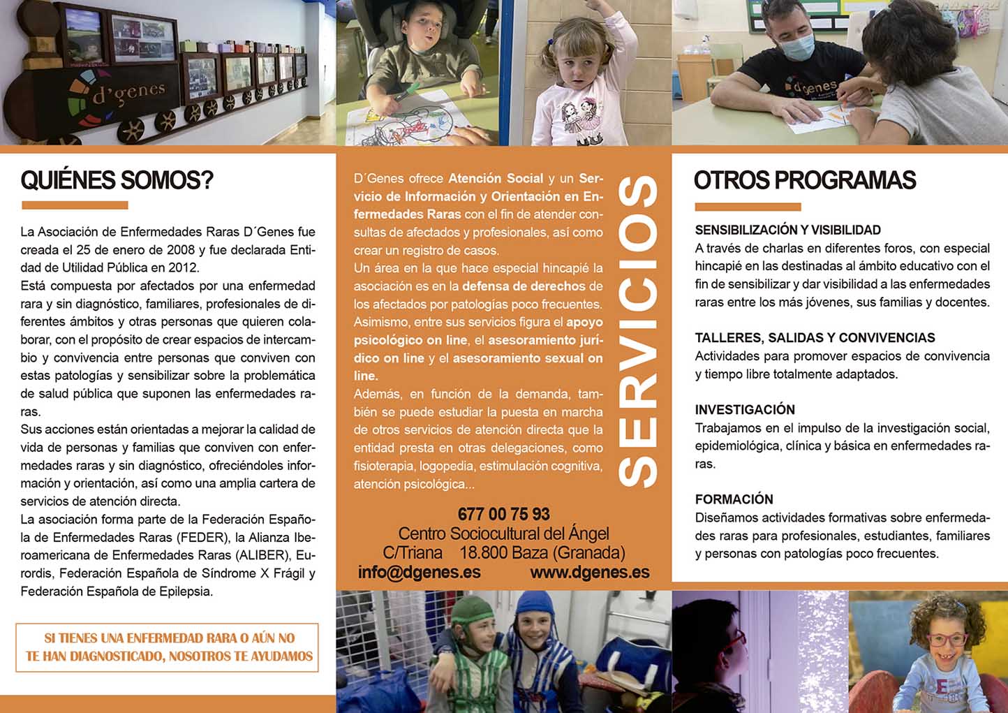 Según se detalla en los folletos informativos elaborados por la propia asociación —cuyas imágenes acompañan esta información—, la delegación de Baza ofrece atención social y un servicio de información y orientación en enfermedades raras, tanto para pacientes como para profesionales. Además, desarrolla apoyo psicológico en línea, asesoramiento jurídico y orientación en materia afectivo-sexual, así como otras terapias y servicios que se activan en función de la demanda.