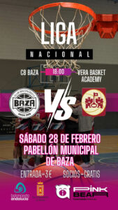 El Pinkbear Baza defiende su fortaleza en casa ante el potente Vera Academy. El baloncesto vuelve a citar a la afición bastetana este sábado 28 de febrero. A partir de las 18:00 horas, el Pabellón Municipal acogerá un nuevo compromiso del Pinkbear Baza, que se medirá a Vera Academy en un duelo exigente dentro del grupo C de la Primera Nacional Andaluza de Baloncesto, competición organizada por la Federación Andaluza de Baloncesto.