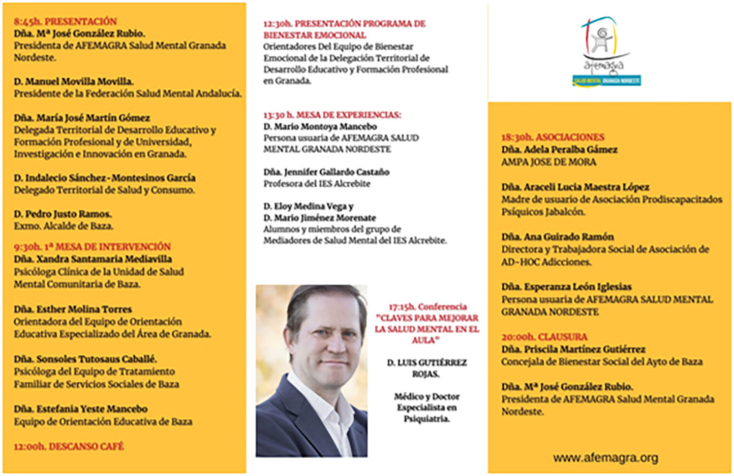 Durante la mañana se abrirán dos mesas de intervenciones para que los participantes cuenten sus experiencias personales y se presentará el Programa de Bienestar Emocional, por parte de los orientadores del Equipo de Bienestar Emocional de la delegación. Ya por la tarde, a partir de las 17:15, se abrirá con la conferencia “Claves para mejorar la salud mental en el aula”, a cargo de Luis Gutiérrez, médico y doctor especialista en Psiquiatría. Participarán después varias asociaciones de la ciudad y la concejala de Bienestar Social, Priscila Martínez, junto a la presidenta de Afemagra, Mª José González, clausurarán el evento, a las ocho de la tarde.