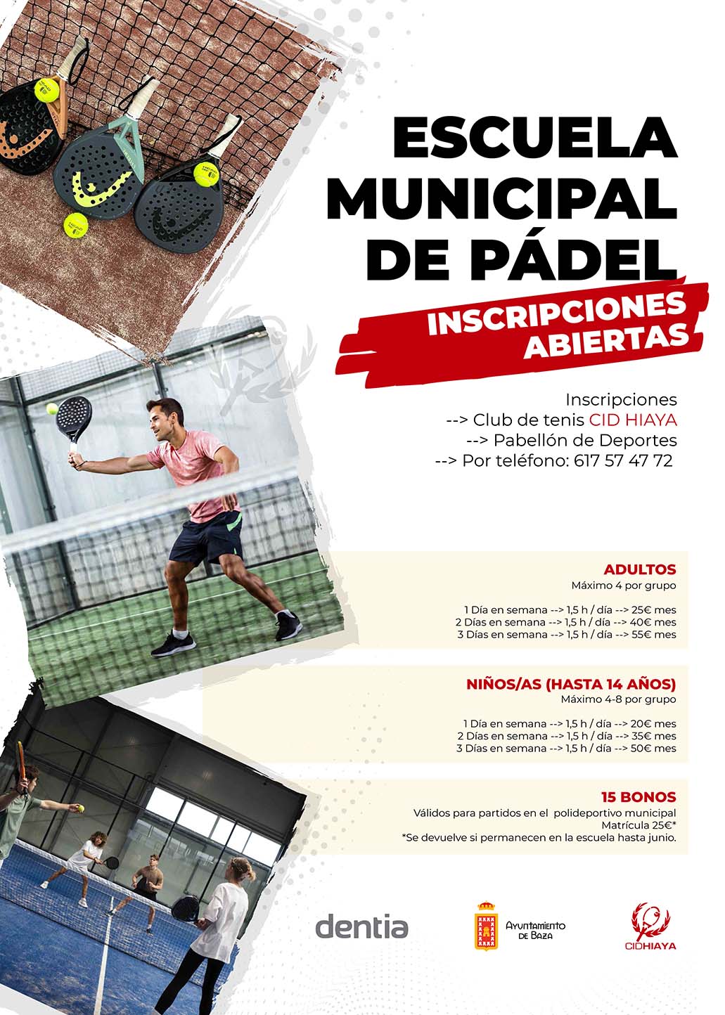 La Escuela Municipal de Pádel del Ayuntamiento de Baza, que estará en funcionamiento hasta el 21 de junio de 2024, dispone de dos modalidades: adultos y niños de hasta 14 años. En ambos casos se han establecido tres tipos de inscripciones, según que se desee acudir a ella un día, dos días o tres días en semana, a razón de una hora y media por día. Cada tipo de asistencia tendrá una cuota mensual, a la que hay que añadir 25 euros de matrícula, que se devolverán al terminar la Escuela siempre que el alumno haya acudido con alta regularidad. Para hacer más atractiva la pertenencia a la escuela se entregarán quince bonos con el 25% de descuento para la utilización de las pistas de pádel del Polideportivo Municipal.