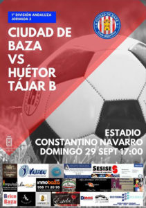 El CD Ciudad de Baza buscará el domingo su primer triunfo liguero ante el Huétor Tájar B. Será el próximo domingo 29 de septiembre, a las cinco de la tarde, en el Municipal “Constantino Navarro”, en encuentro correspondiente a la tercera jornada liguera del grupo granadino de la Primera Andaluza.